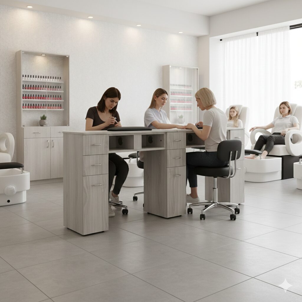 - Nail table sits on top of wheels
